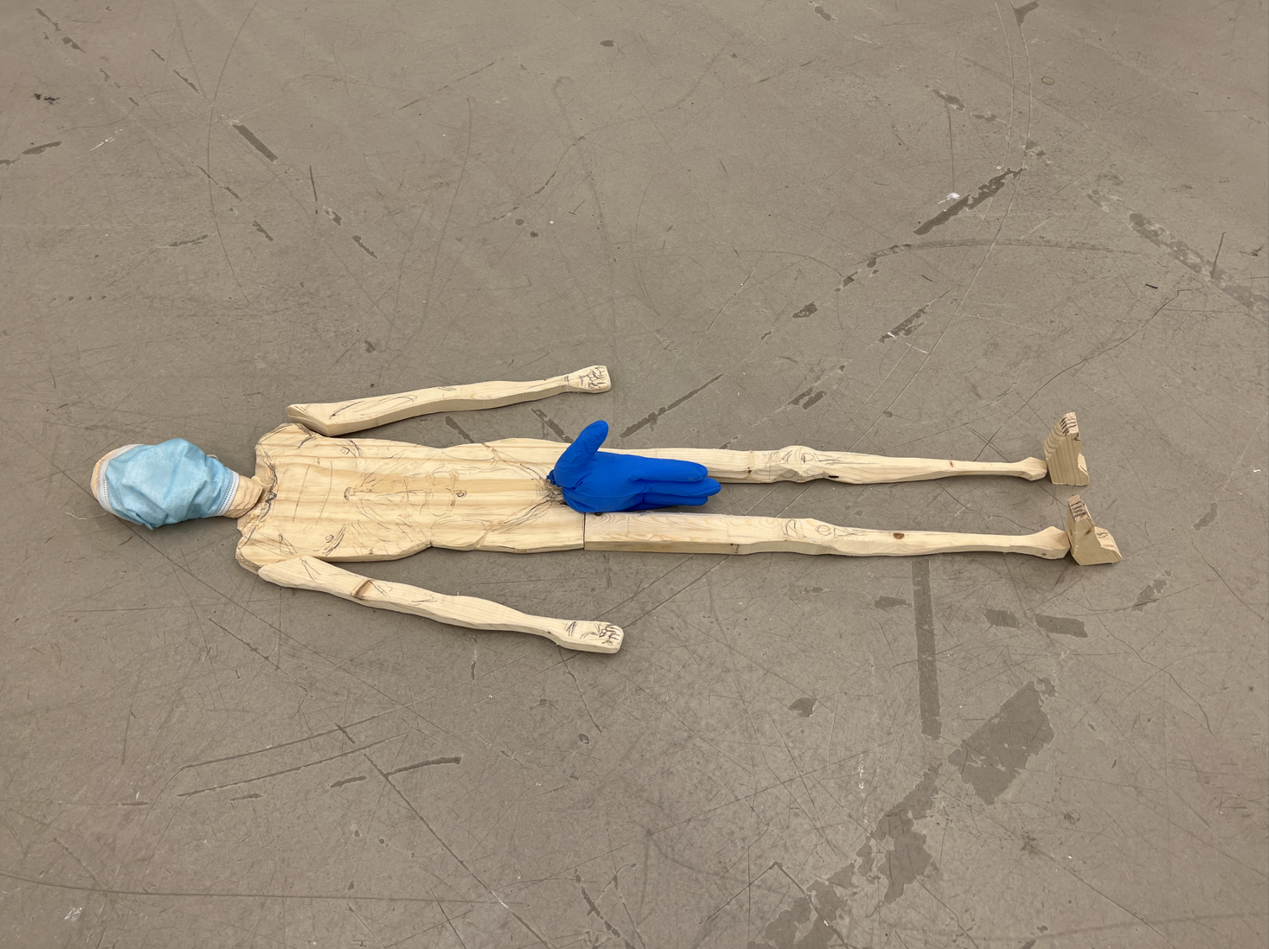 In the "Protected" chapter of this sculpture, the artist presents a depiction of fragility and weakness through the use of a male figure that is incompletely carved, static in its pose, and covered with a used surgical mask. The figure's genital region, made from a deflating latex glove, serves as a metaphor for the slow decline of both physical and mental abilities over time. Through the use of these elements, the artist seeks to convey a sense of anonymity, dehumanization, and ongoing decay within both the individual and the surrounding world. The use of a shape and material traditionally associated with a crucifix adds a layer of meaning related to the worship of entropy rather than order.